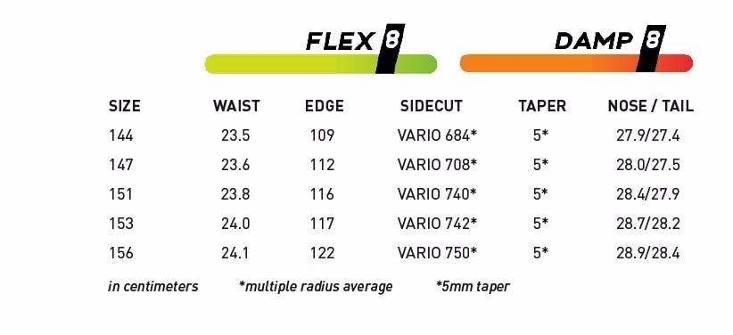 Größe: 144cmWaist: 23,5cmEdge: 109cmSidecut: Vario 684Taper: 5mmNose/Tail: 27,9/27,4cmFlex: 8Damp: 8