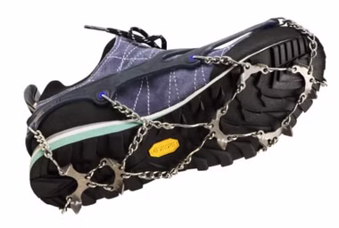 Die schlanken Kettenglieder und der dünne Elastomer-Gummi sorgen für sicheren Sitz gerade auch auf leichten Wanderoder Laufschuhen. Flexible Fersenkrallen lassen den Fuß ergonomisch abrollen.